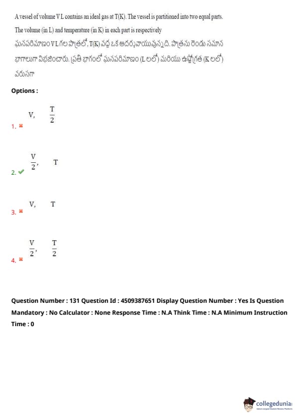 A vessel of volume \( V \) L contains an ideal gas at \( T(K) \). The vessel is partitioned into two equal parts. The volume (in L) and temperature (in K) in each part is respectively:
