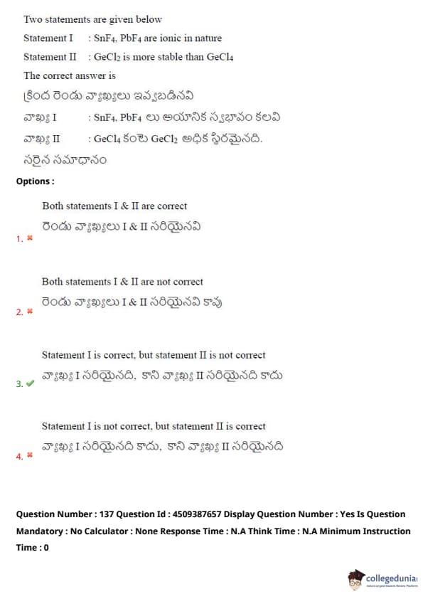 Statement II: GeCl\(_2\) is more stable than GeCl\(_4\).