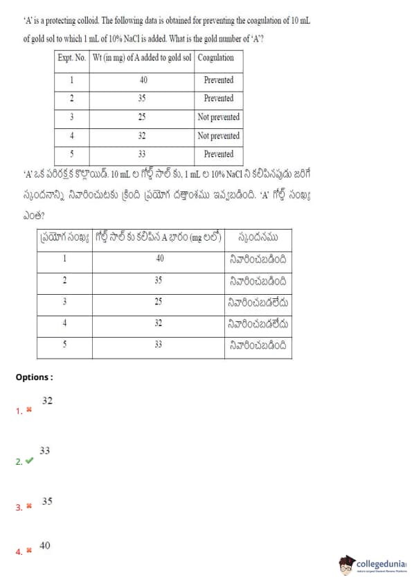 ‘A’ is a protecting colloid. The following data is obtained for preventing the coagulation of 10 mL of gold sol to which 1 mL of 10% NaCl is added. What is the gold number of ‘A’?