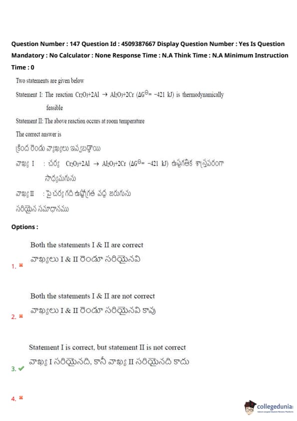 Statement I: The reaction Cr\(_2\)O\(_3\) + 2Al → 2Cr + Al\(_2\)O\(_3\) (ΔG° = -421 kJ) is thermodynamically feasible.