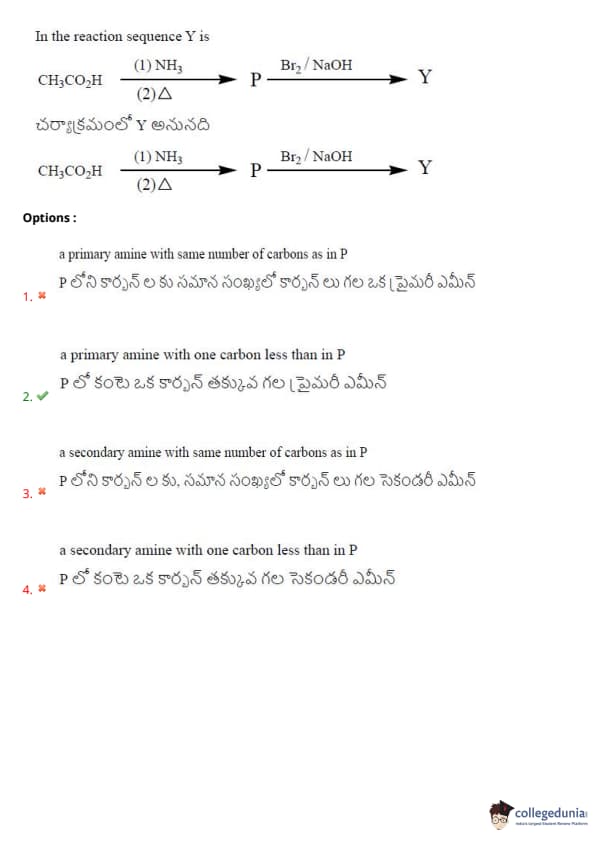\[ CH_3CO_2H \xrightarrow{(1) NH_3, (2) \Delta} P \xrightarrow{Br_2/NaOH} Y \]