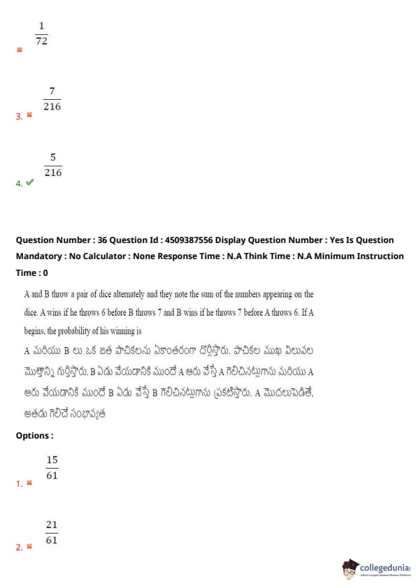A and B throw a pair of dice alternately and they note the sum of the numbers appearing on the dice. A wins if he throws 6 before B throws 7, and B wins if he throws 7 before A throws 6. If A begins, the probability of his winning is: