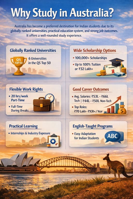 Australia has become a preferred destination for Indian students due to its globally ranked universities, practical education system, and strong job outcomes. With a balance of quality education and career opportunities, it offers a well-rounded study experience.