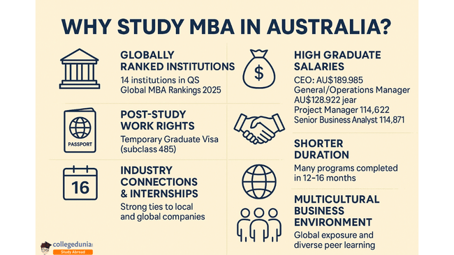 Australia is home to top-ranked MBA colleges offering globally recognized programs, strong industry connections, and high earning potential. With competitive GMAT-based admissions and diverse specializations, universities like Melbourne Business School and UNSW AGSM attract students seeking quality education and post-study work opportunities.