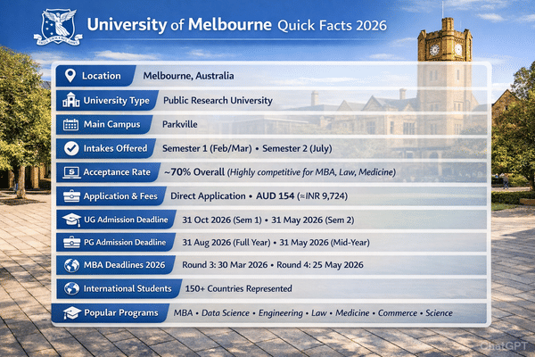 The University of Melbourne offers two main intakes each year: Semester 1 (February/March) and Semester 2 (July). Semester 1 is the most popular choice for Indian students. Ranked #19 globally (QS 2026), the university attracts students from over 150 countries and offers 400+ undergraduate and graduate programs. While the university does not publish an official acceptance rate, unofficial estimates suggest it ranges between 70–80%, depending on the course. Because admissions are competitive, students should understand course requirements, timelines, and Australia’s student visa process early.