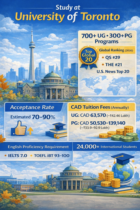 The University of Toronto (U of T) is a public research-based university in Canada. It has 3 campuses: St. George, Mississauga, and Scarborough, with St. George being the main and oldest campus located in downtown Toronto. U of T is among the top universities in Canada and is globally recognised, ranking QS #29, THE #21, and US News Top 20 in 2026. The university does not publish an official acceptance rate, but third-party sources estimate it between 70–90% for international students. As per the 2024–25 intake, St. George campus hosted 69,976 students, including 24,449 international students, creating a diverse and dynamic campus environment.