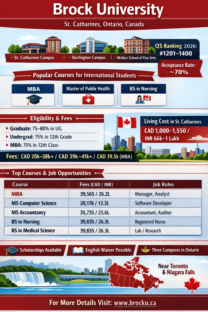 Brock University is a public research institute, situated in St.Catherine’s, Ontario, Canada. It has 3 campuses: St.Catherine’s (Main campus), Burlington, Marilyn I. Walker School of Fine and Performing Arts. It also has the Goodman School of Business offering an MBA program. Brock University has been ranked #1201-1400 by QS World University Rankings in 2026. The estimated acceptance rate of the university is 70%. Some of the popular courses opted for by international students are MBA, Master of Public Health, and BS in Nursing.