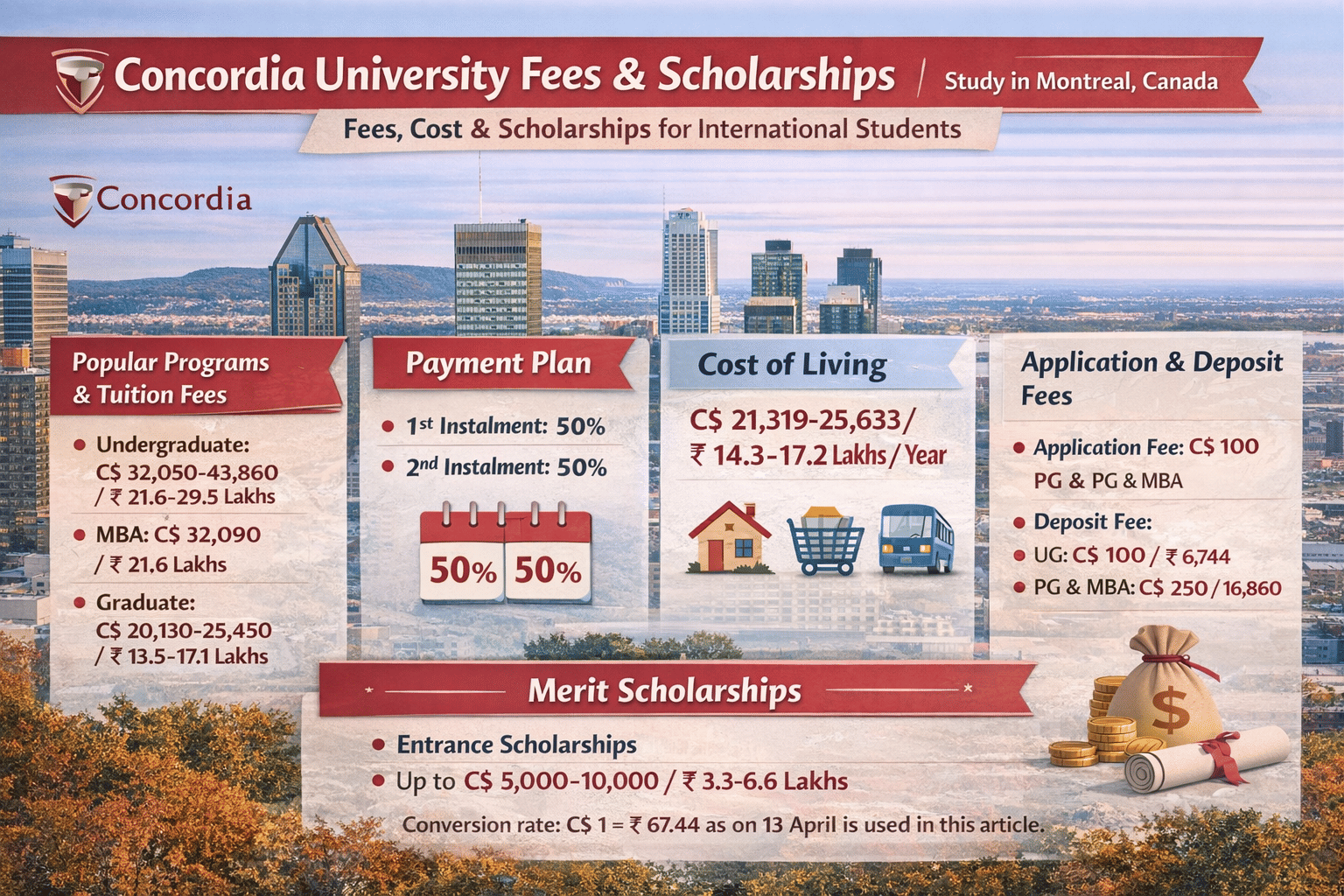 International students living in Montreal can expect an annual expense in the range of C$ 21,319-25,633 / ₹ 14.3-17.2 Lakhs. Concordia University offers scholarships like Entrance Scholarships and Merit Scholarships, with awards ranging from C$ 5,000-10,000 / ₹ 3.3-6.6 Lakhs.