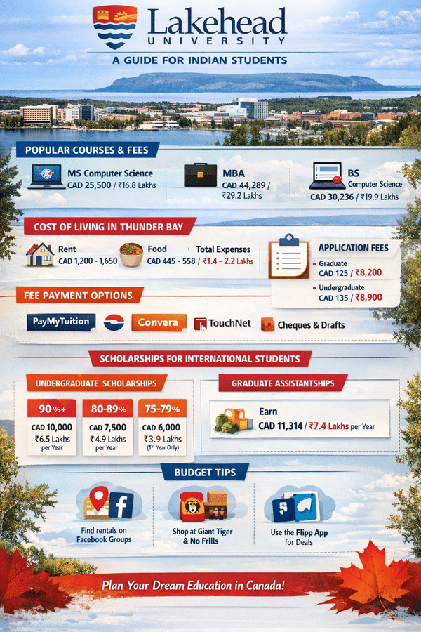 The monthly expenses for international students living in Thunder Bay, Ontario, can range from CAD 2,175-3,473/ INR 1.4-2.2 Lakhs. To manage the expenses of students, Lakehead University offers scholarships to international students, which offer support of CAD 6,000-11,300/ INR 3.9-7.4 Lakhs.