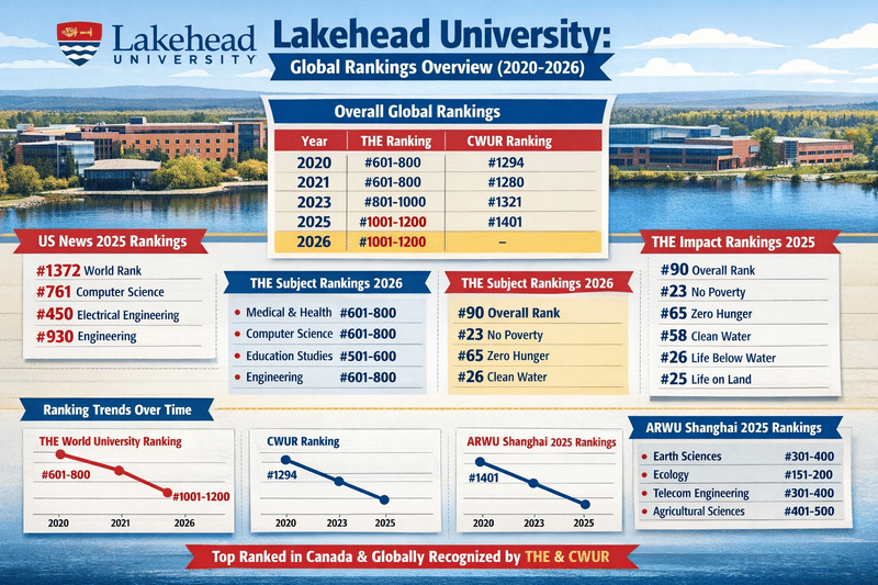 Lakehead University has seen a decline in rankings from 2020 (#601-800) to 2026 (#1001-1200) according to THE World University Rankings and from (#1294) in 2020 to (#1401) in 2025 according to the Centre for World University Rankings (CWUR).