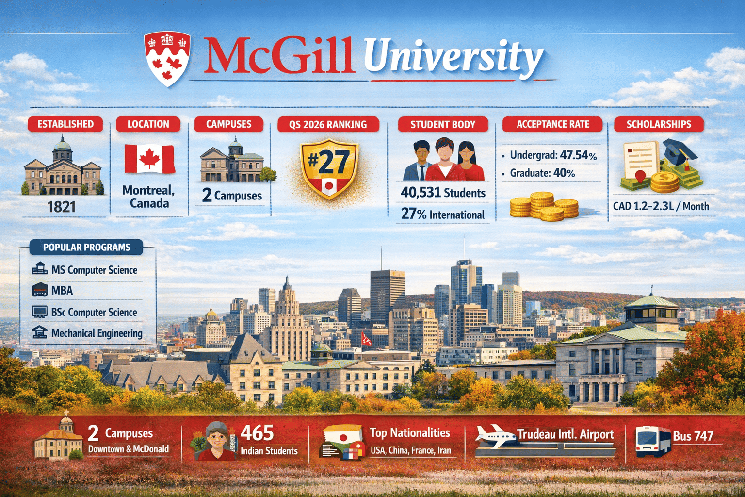 McGill University is a public institution, established in the year 1821. It is located in Montreal, Canada. It has 2 campuses: Downtown (Main campus) and the McDonald campus. It has been ranked #27 by QS World University Rankings in 2026. The university has 11 faculties that offer more than 120 programs to students. Some of the popular programs at McGill University include MS Computer Science, MBA, BSc Computer Science, and others. The acceptance rate for undergraduate programs is 47.54%, and for graduate programs is 40%.