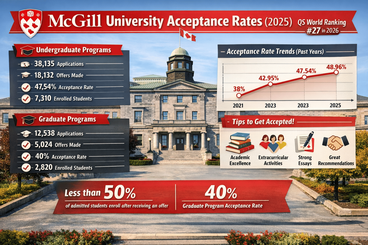 McGill University is one of the top institutions in Canada, with a QS global rank of #27 in 2026. Many students want to study at this university due to its reputation and high global rankings. In the year 2025, 38,135 students applied for undergraduate program admission, and 18,132 students were offered admission. Out of this, only 7,310 students enrolled at McGill University. Similarly, in 2025, 12,538 students applied for admission to graduate programs, and 5,024 were offered admission; out of this, only 2,820 actually enrolled at McGill University.