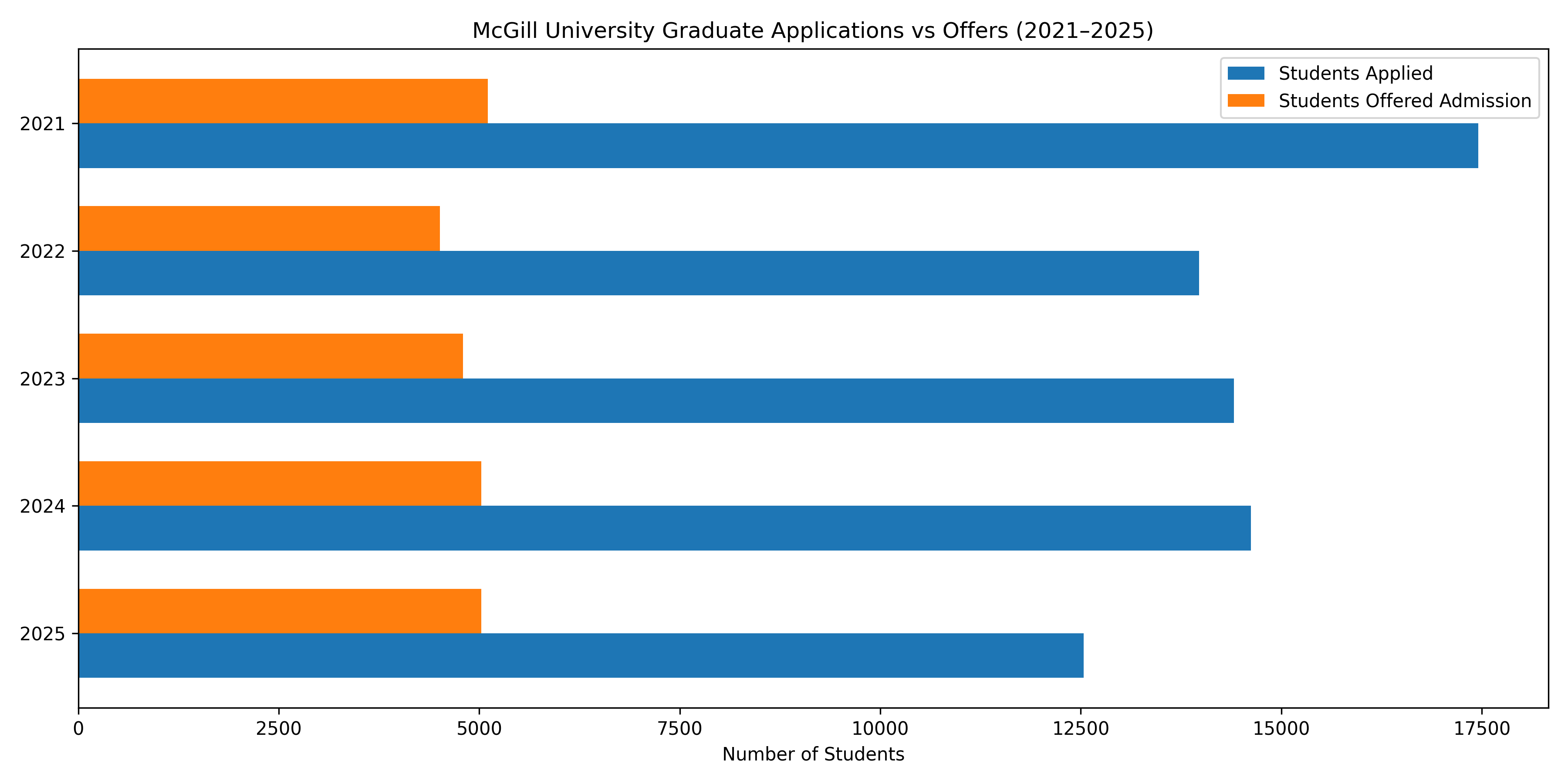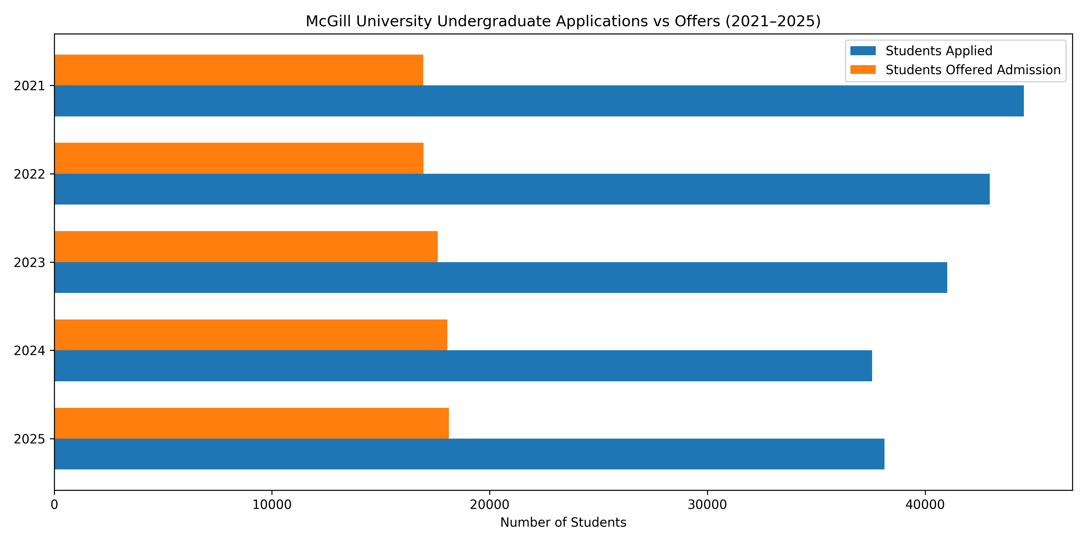Note: The data on the number of students who applied and the number of applicants who received an offer letter, and how many applicants were actually admitted, is taken from the official website of McGill University Admissions Profile. The acceptance rate is calculated using the formula and official data.