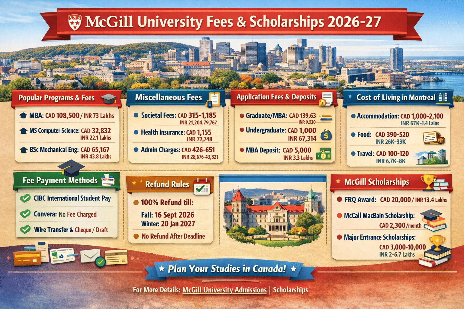| McCall MacBain Scholarship | Awarded to students with academic excellence and leadership qualities | Tuition fees and a living stipend of CAD 2,300 per month | Tuition fees and a living stipend of INR 1.5 Lakhs per month |