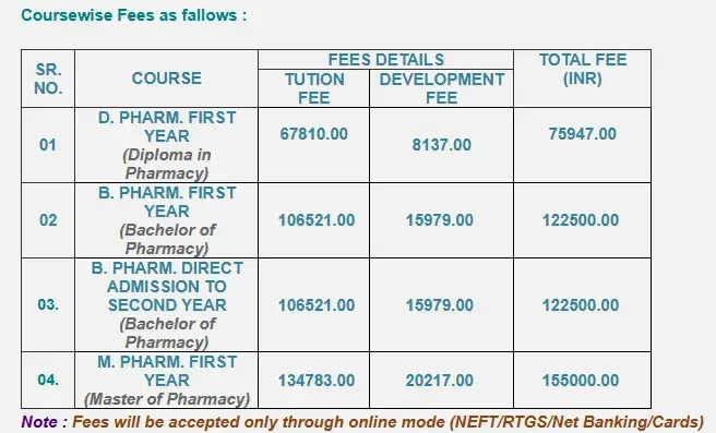 Smt Kishoritai Bhoyar College of Pharmacy Nagpur M.Pharm Quality Assurance fees in first year is ₹ 1.55 Lakhs. The detailed fees is mentioned below.Smt Kishoritai Bhoyar College of Pharmacy Nagpur offers a total of 15 seats for M.Pharm Quality Assurance.