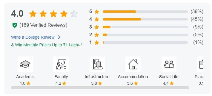 Overall Rating: The college has an overall rating of 4.0 out of 5, with 169 reviews, which are verified and give a positive rating of student satisfaction.