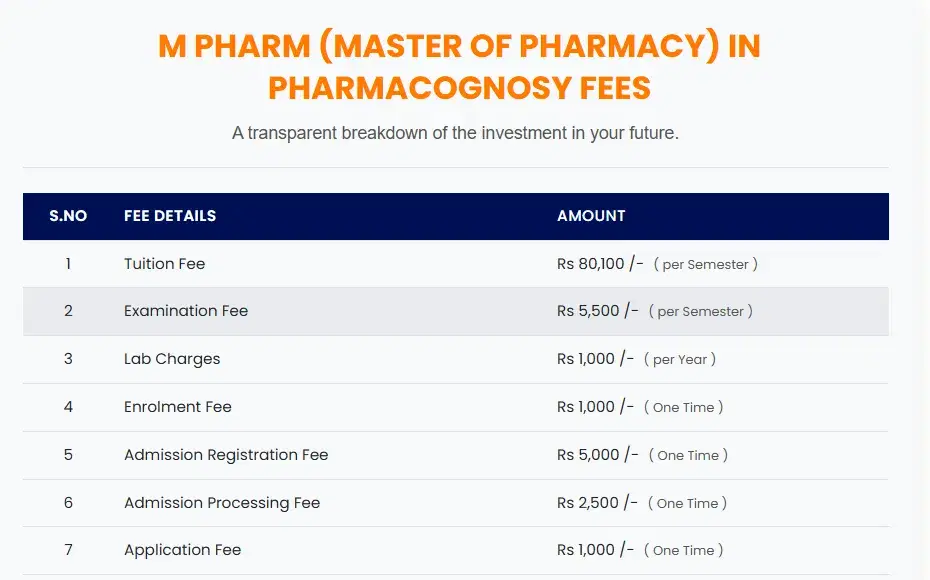 Teerthanker Mahaveer University, College of Pharmacy Moradabad M.Pharm Pharmacognosy fees in first year is ₹ 1.81 Lakhs. The detailed fees is mentioned below.Teerthanker Mahaveer University, College of Pharmacy Moradabad Hostel Fee is ₹ 50,400 to 1.3 Lakhs.