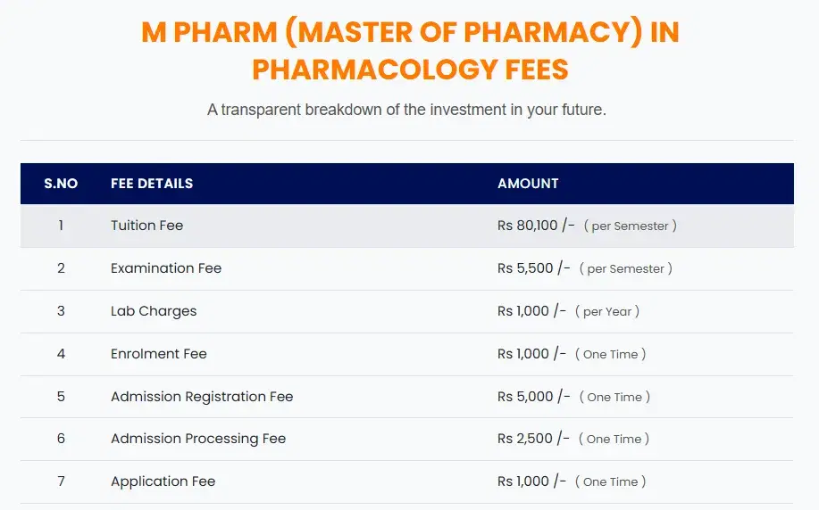 Teerthanker Mahaveer University, College of Pharmacy Moradabad M.Pharm Pharmacology fees in first year is ₹ 1.81 Lakhs. The detailed fees is mentioned below.Teerthanker Mahaveer University, College of Pharmacy Moradabad Hostel Fee is ₹ 50,400 to 1.3 Lakhs.