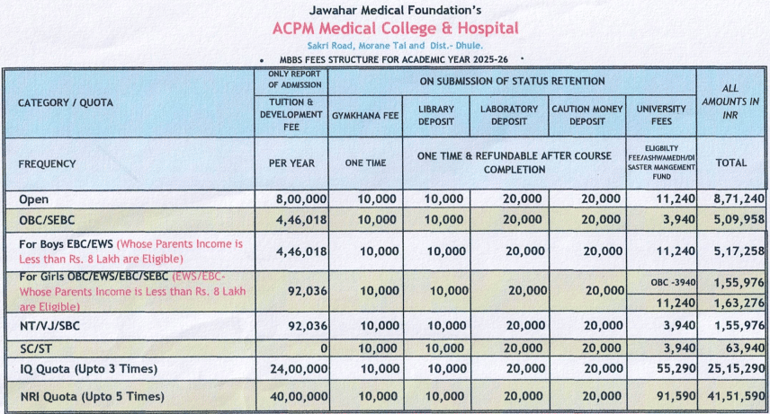 Admission to ACPM Medical College's MBBS program is based on the NEET UG exam and 12th-grade academic performance. Candidates must have a science background in 12th grade with at least 50% aggregate marks. Admissions involve a NEET exam, result acquisition, and a counseling session, with a merit list based on NEET scores and 12th-grade marks. The college has experienced faculty with about 20 years of experience and maintains a favorable faculty-to-student ratio.