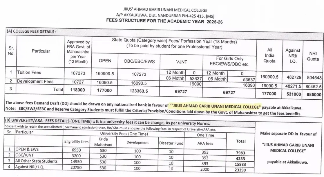 For students applying under the NRI quota for admission, the total course fee for BUMS Kamil-E-Tibb-O-Jarahat at Jamia's Ahmad Garib Unani Medical College Nandurbar is ₹ 44.48 Lakhs.