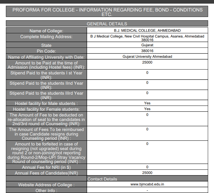 Admission to BJ Medical College in Ahmedabad is determined by the NEET-UG exam, which totals 720 marks. The college admits 250 students per year through a 15% All India Quota and an 85% State Quota. Recognized as Gujarat's top medical college, it's linked with Asia's largest hospital, offering rich practical exposure. The faculty is highly experienced, with a favorable 1:5 student ratio, and uses modern teaching methods. The annual tuition fee is INR 25,000, totaling INR 1,12,500 over 4.5 years, significantly lower than private colleges.