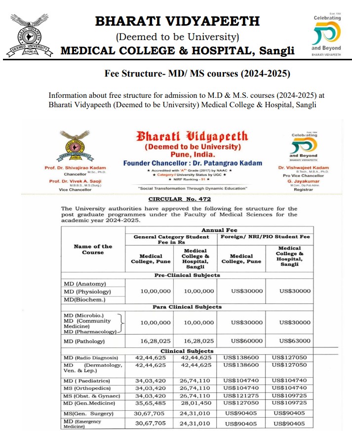 30 Aug, 2025 Bharati Vidyapeeth Deemed University Medical College and Hospital Sangli M.S General Surgery Fee structure 2025-26 has been released. The Academic Fee is ₹ 24.31 Lakhs/Yr.