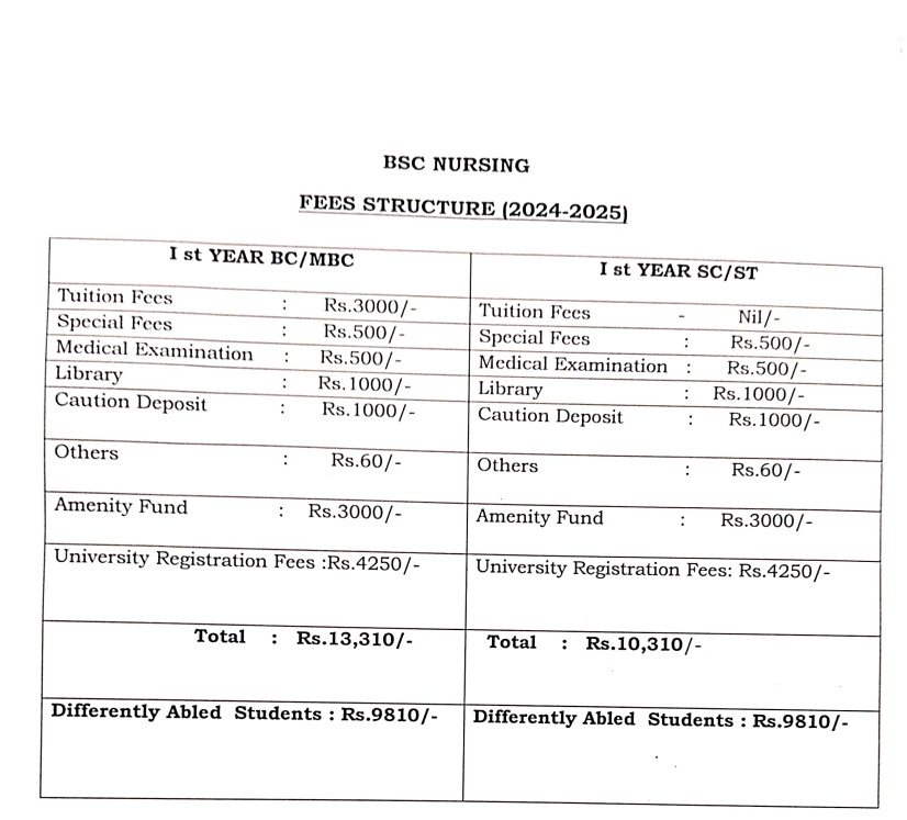 Government Chengalpattu Medical College Kanchipuram B.Sc (Nursing) Nursing fees in first year is ₹ 13,310. The detailed fees is mentioned below.Government Chengalpattu Medical College Kanchipuram Hostel Fee is ₹ 35,000.