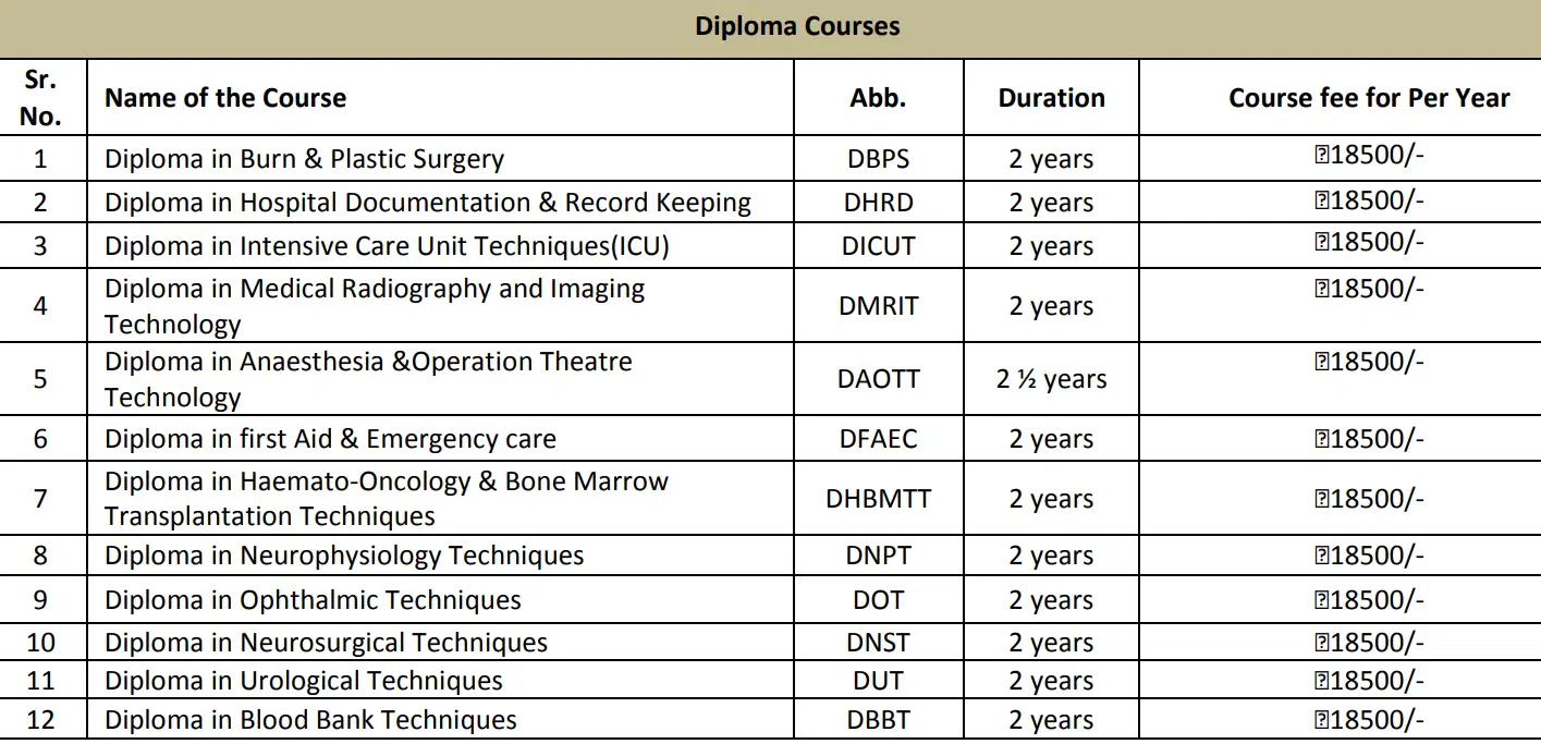 DMCH Ludhiana Diploma Operation Theatre Technology is offered as 2 Years 6 Months Full Time program, with total intake of 10 seats. The minimum eligibility criteria for Diploma is 10+2. The total fees for DMCH Ludhiana Diploma Operation Theatre Technology in 2025 is ₹ 75,100 for the complete course duration, which includes total tuition fees of ₹ 37,000.