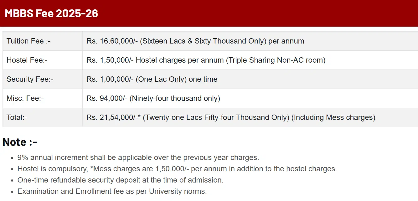 Tuition fees are approximately 20 lakh INR annually, with mandatory hostel and mess fees costing 3 lakh INR and a 7% possible annual increase. Examination fees have also risen to 1 lakh INR.
