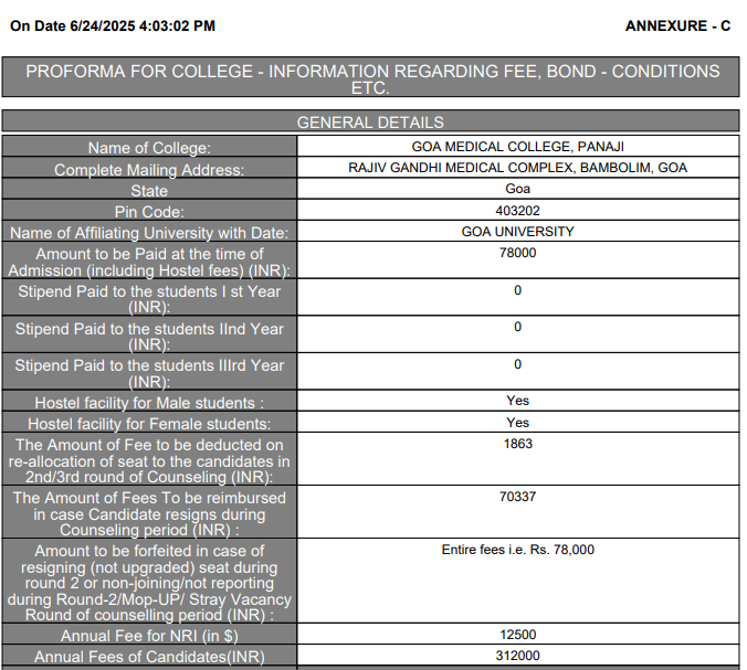 **Goa Medical College** offers an **MBBS program** primarily based on **NEET scores**, emphasizing **merit-based selection**. Applicants must score at least **50% in their 12th board exams** and secure a **qualifying NEET rank**. Admission involves an **offline counseling session** after the merit list is published, with **85% of seats reserved for Goa residents** and **15% for other Indian students**. **SC/ST candidates receive relaxed criteria**. NEET occurs in May, with results by **mid-June**.