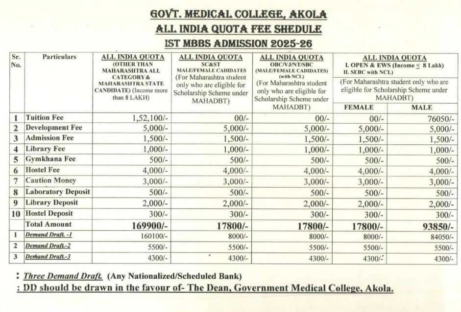 6,000 to Rs. 25,000. Although there are no direct placements, the internship prepares students for post-graduate exams and enhances job opportunities. Reserved category students benefit from significant tuition fee reductions; OBC students receive waivers through the Rajshri Shahu Maharaj scholarship, and economically backward students receive additional support. Open category fees range from Rs. 120,000 to Rs. 150,000 annually, with first-year fees at Rs. 140,000 and subsequent years varying. The college facilitates government scholarships like the Post Metric Scholarship for OBCs, and Mahadbt.