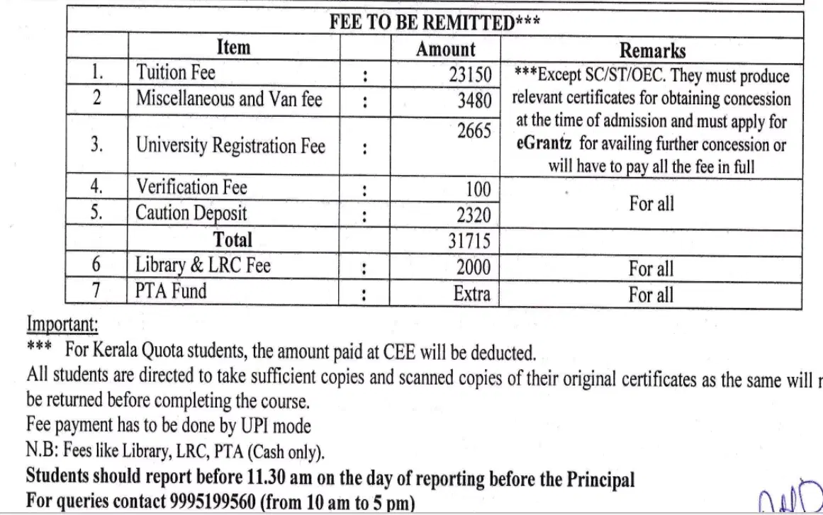 20,000 for most years, and an initial fee of Rs. 25,000 in the first year. Additional costs include miscellaneous fees of Rs. 3,000 annually and hostel fees starting at Rs. 10,000, reducing to Rs. 5,000 in subsequent years, with a mess fee of about Rs. 2,200 monthly. Students from SC, ST, and OEC categories are exempt from fees, and numerous scholarships are available for financially disadvantaged students, including those from economically weaker sections, with options like MOMA and eGrantz covering tuition and hostel fees.