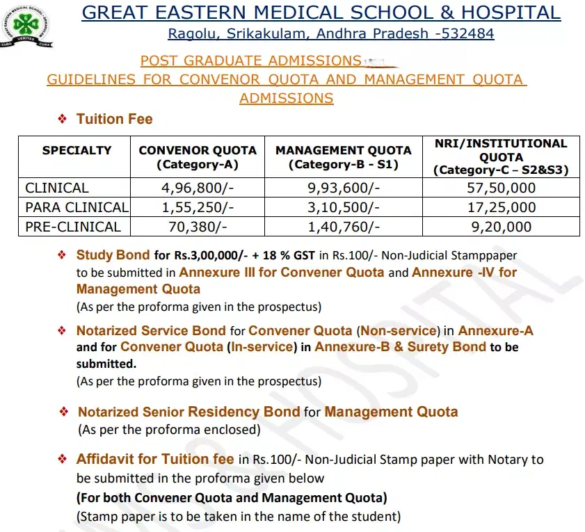 Earlier, M.S Otorhinolaryngology fees at Great Eastern Medical School and Hospital Srikakulam was ₹ 14.9 Lakhs (in 2023) for the entire course duration. This shows that the fee has remained unchanged since 2023.
