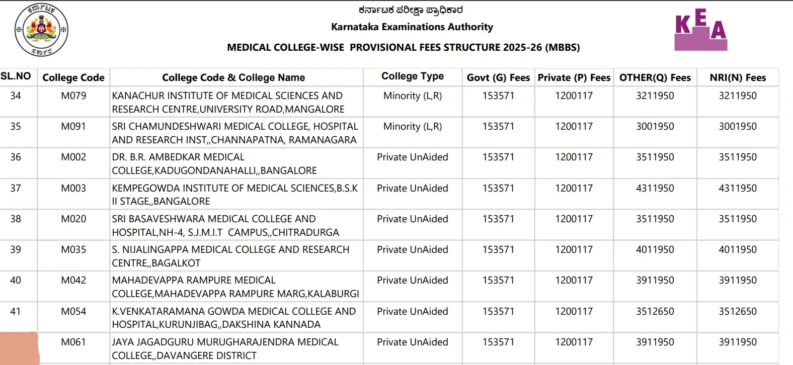 Fees vary by seat type: CET students pay around INR 40,000 annually, government merit seats over INR 1 lakh, COMEDK over INR 7 lakhs, management quota upwards of INR 80 lakhs, and NRI seats over INR 1 crore. Additional fees include sports and library charges of INR 40,000. Government quota students receive a stipend of INR 20,000 to 40,000 during a mandatory one-year internship, but others do not. The college lacks a formal placement portal, as students often continue education or work in hospitals.