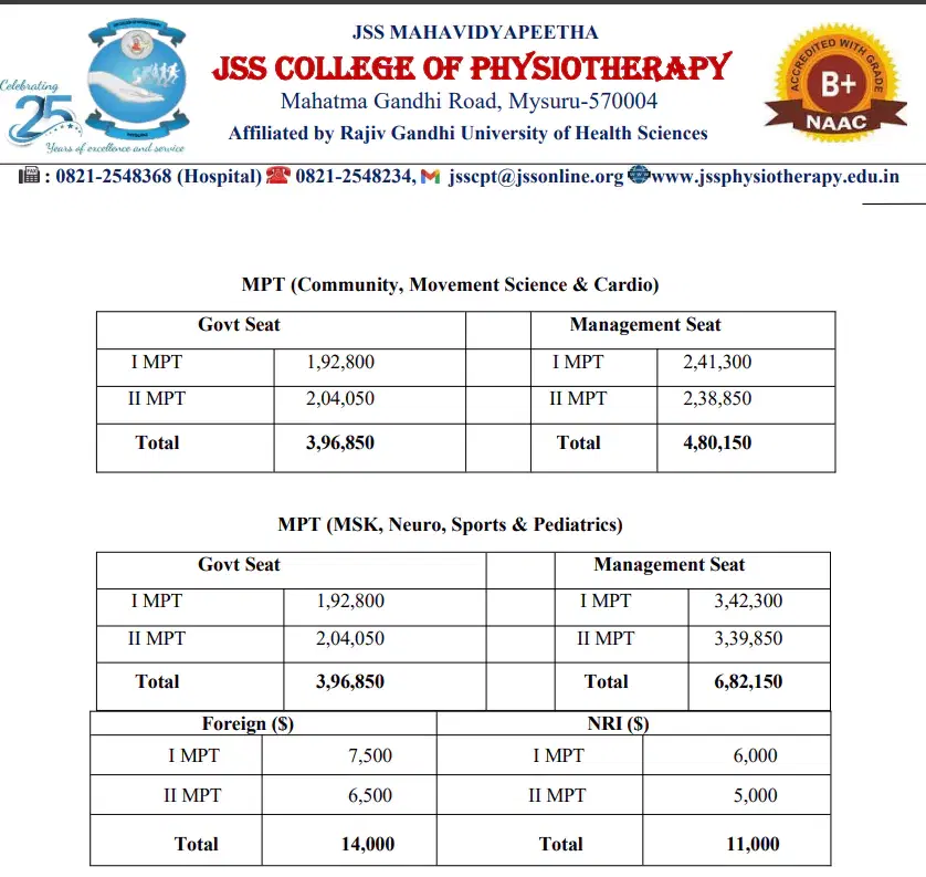 JSS College of Physiotherapy Mysore Hostel Fee is ₹ 67,150.
