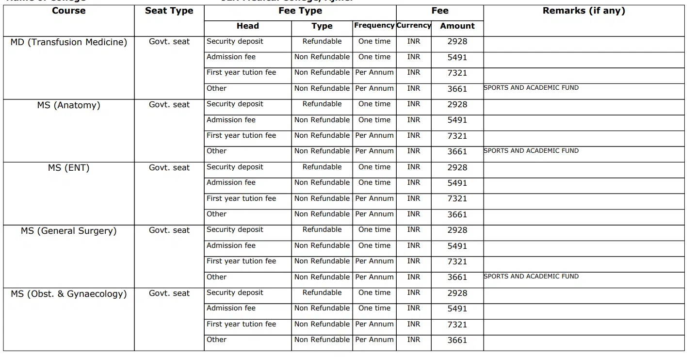 | Fees | Year 1 (in INR) | Year 2 (in INR) | Year 3 (in INR) |