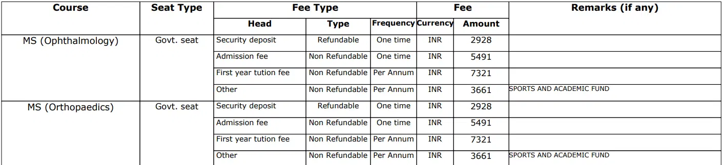 JLN Ajmer M.S Ophthalmology is offered as 3 Years Full Time program, with total intake of 10 seats. The minimum eligibility criteria for M.S is MBBS+ NEET PG. The total fees for JLN Ajmer M.S Ophthalmology in 2025 is ₹ 41,365 for the complete course duration, which includes total tuition fees of ₹ 21,963.