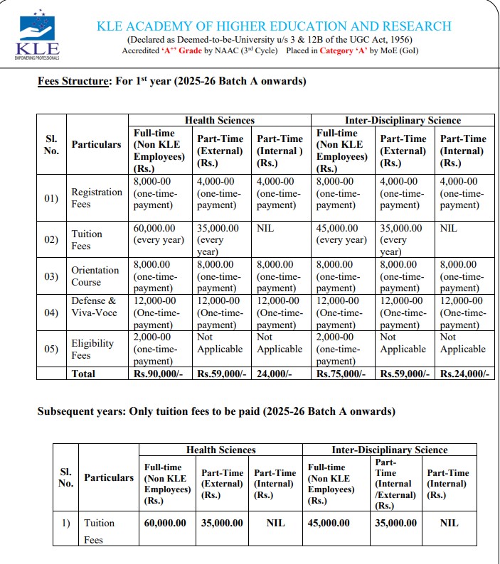 | Fees (2025 - 2026) | Year 1 (in INR) | Year 2 (in INR) | Year 3 (in INR) |