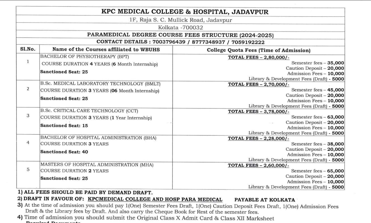 10 Nov, 2025 KPC Hospital Kolkata BHA Fee Structure 2025-2026 has been released. The total academic fee is ₹ 3.8 Lakhs.