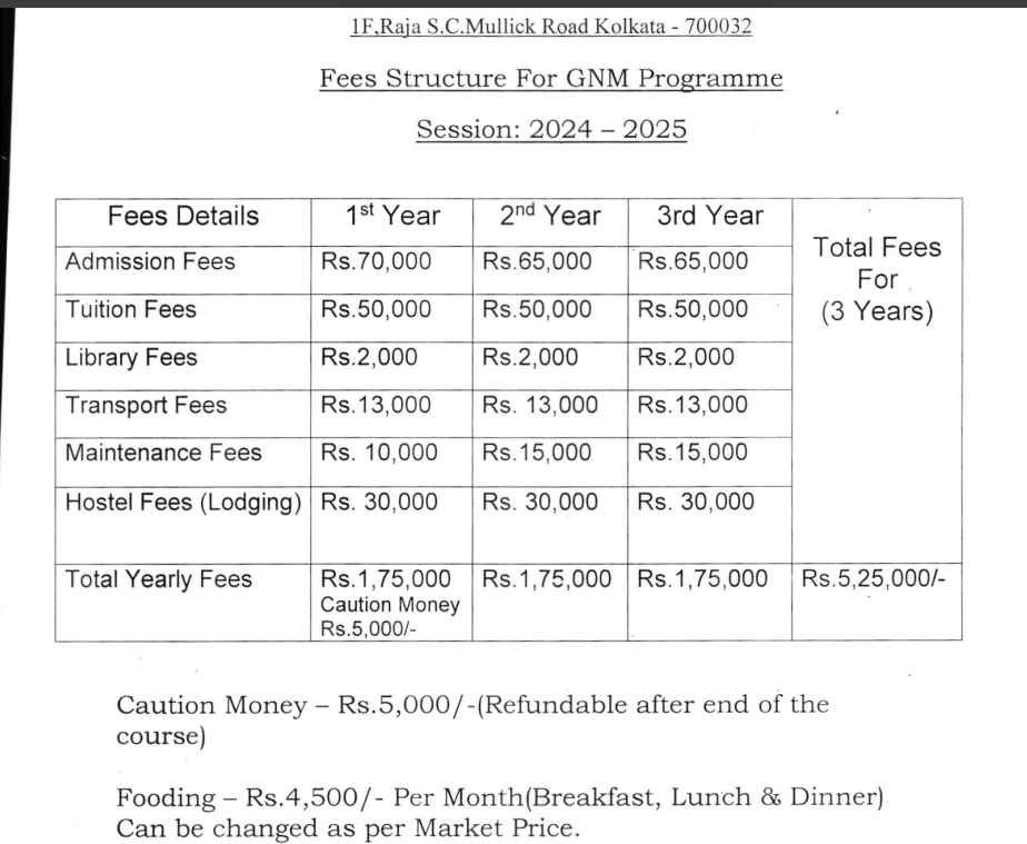 KPC Hospital Kolkata GNM is offered as 3 Years 6 Months Full Time program, with total intake of 50 seats. The minimum eligibility criteria for GNM is 10+2 with 50%. The total fees for KPC Hospital Kolkata GNM in 2025 is ₹ 4.35 Lakhs for the complete course duration, which includes total tuition fees of ₹ 1.5 Lakhs. Earlier, the fees in 2023 - 2024 for GNM was ₹ 4.31 Lakhs.
