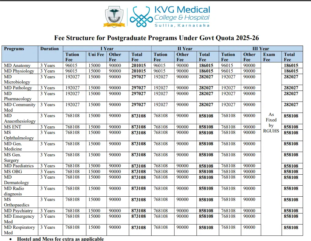 KVG Medical College and Hospital Sullia M.D Anesthesiology fees in first year is ₹ 8.73 Lakhs. The detailed fees is mentioned below.KVG Medical College and Hospital Sullia offers a total of 6 seats for M.D Anesthesiology. Admissions are offered based on Karnataka-NEET-PG-Counselling.
