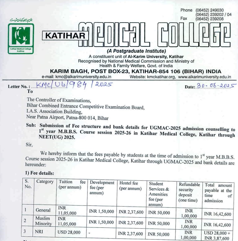 Admission to the MBBS program at Katihar Medical College is based on NEET scores, with 50% of seats reserved for Muslim students. Applicants must have completed 10+2 with at least 50% in Physics, Chemistry, Biology/Biotechnology, and English. The college has a well-qualified faculty, with a favorable faculty-to-student ratio. The MBBS course costs around Rs 52 lakh for 4.5 years, excluding hostel and other fees, totaling approximately Rs 80 lakh. For Muslim minority and general categories, the annual fee is Rs 13,50,000, while NRI candidates pay Rs 24 lakh annually.