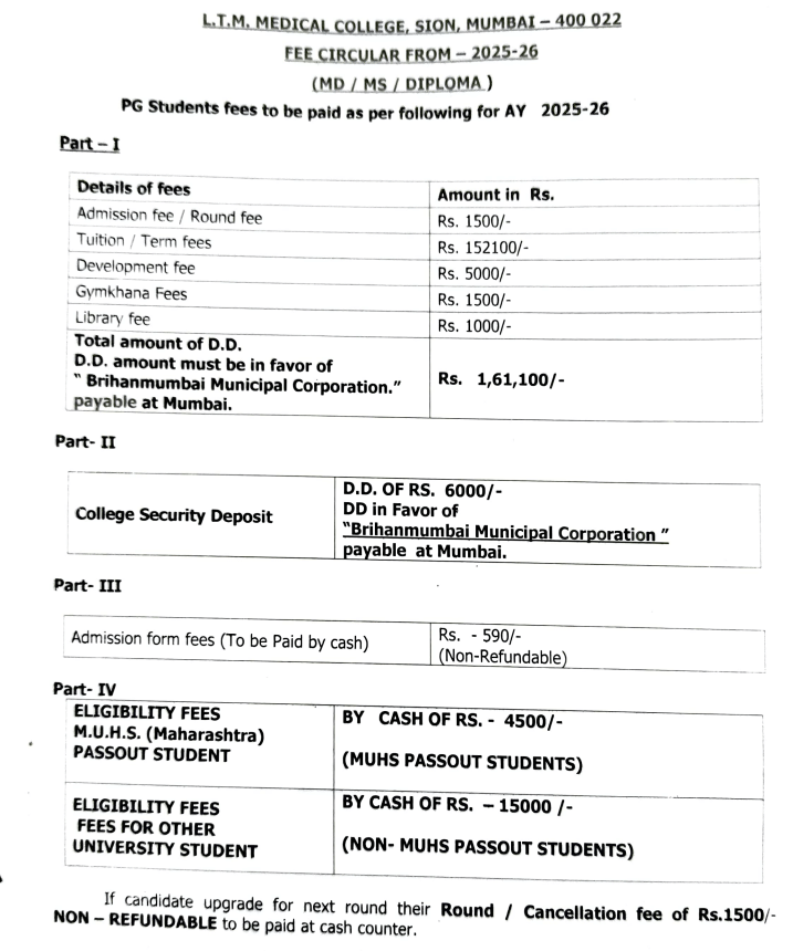 LTMMC PG Diploma Medical Laboratory Technology is offered as 2 Years Full Time program. The minimum eligibility criteria for PG Diploma is Graduation. The total fees for LTMMC PG Diploma Medical Laboratory Technology in 2025 is ₹ 2.91 Lakhs for the complete course duration, which includes total tuition fees of ₹ 2.77 Lakhs. Earlier, the fees in 2024 - 2025 for PG Diploma Medical Laboratory Technology was ₹ 2.91 Lakhs.