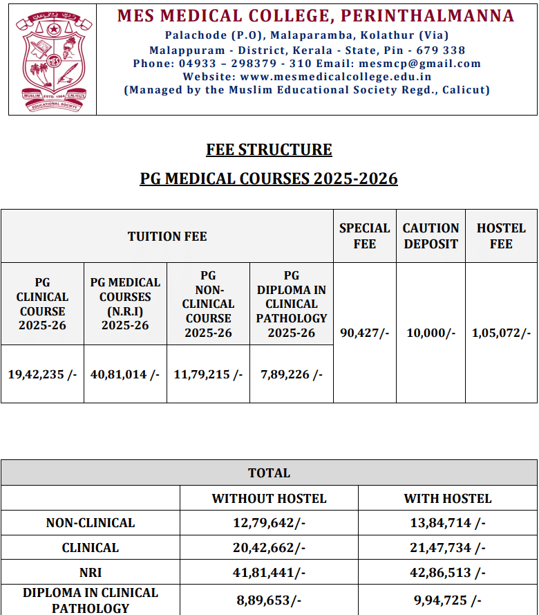 MES Medical College and Hospital Malappuram Hostel Fee is ₹ 1.11 Lakhs.