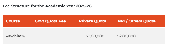 For students applying under the NRI quota for admission, the total course fee for M.D Psychiatry at MSRMC Bangalore is ₹ 1.56 Crore.