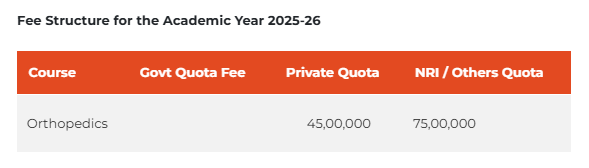 Earlier, M.S Orthopaedics fees at MSRMC Bangalore was ₹ 1.35 Crore (in 2024) for the entire course duration. This shows that the fee has remained unchanged since 2024.