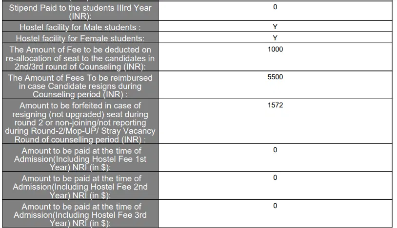 The fee structure is affordable, with academic fees per semester ranging from Rs. 4500 to Rs. 5672, and a nominal hostel fee of Rs. 12 per month. For the entire 5.5-year course, the total tuition and hostel fees range between Rs. 41,148 and Rs. 51,048. Examination fees total Rs. 8000 over the course, and food expenses are approximately Rs. 3000 to Rs. 3500 per month. Students complete a mandatory 1-year internship with a stipend between Rs.