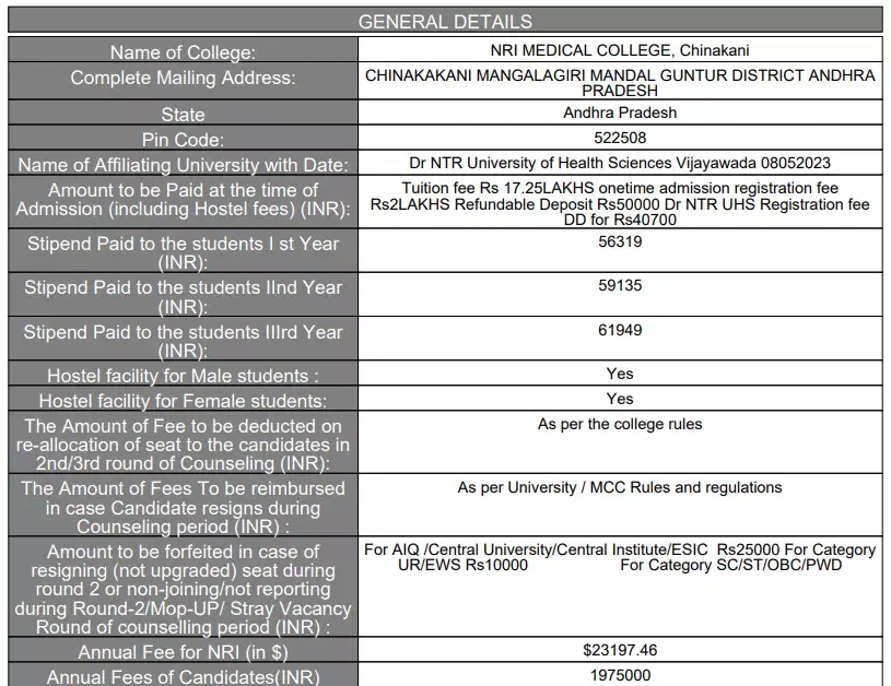 - NRI Medical College Guntur Hostel Fee is ₹ 45,000.