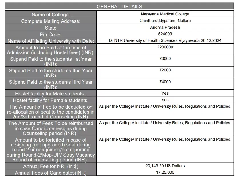 Narayana Medical College and Hospital Nellore Hostel Fee for Male is ₹ 1.55 Lakhs to 1.9 Lakhs. Hostel Fee for Female at Narayana Medical College and Hospital Nellore is ₹ 1.38 Lakhs to 1.98 Lakhs.