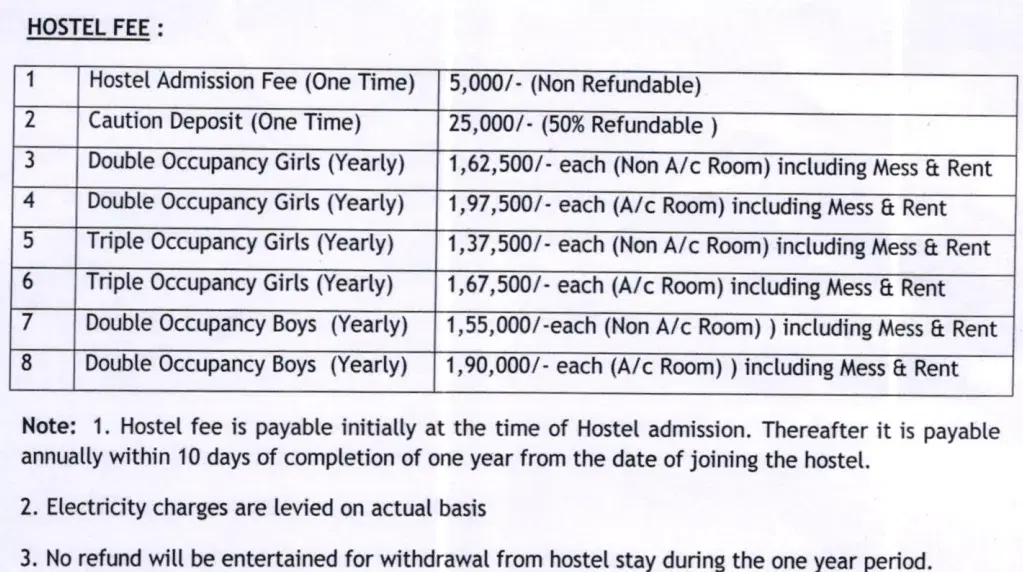 The hostel at Narayana Medical College offers separate accommodations for boys and girls, with a choice of 2 or 3 sharing rooms, and options for AC or non-AC. The hostel fees range from INR 1.3 Lakhs to INR 3 Lakhs annually, with a typical fee hike of INR 10,000 per annum. Rooms are equipped with 2 beds, 2 tables, 2 chairs, 2 lights, 1 fan, and 4 shelves, alongside 24-hour power and water supply, WiFi, geyser, and security through CCTV cameras.